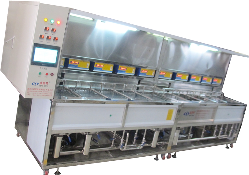 設備共有11個功能槽,配置有循環過濾系統、有機溶劑蒸餾回收系統、自動恒溫系統、慢拉系統、拋動系統、超聲波清洗系統、抽風裝置等組成。