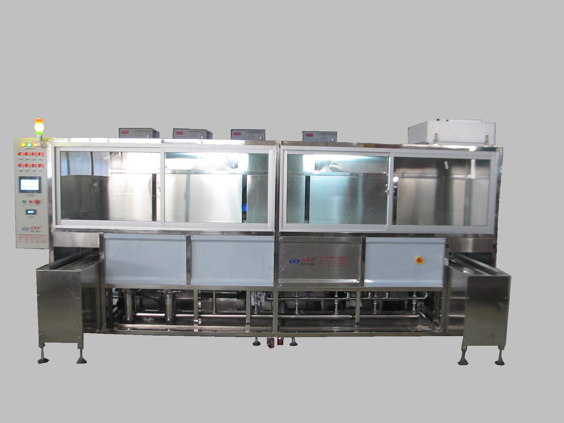 本設備是一個全自動清洗系統,清洗過程由PLC控制,由7個不銹鋼材質制作的超聲波清洗槽及相對應的儲液槽、拋動裝置組成的一條連續工作的裝置。
